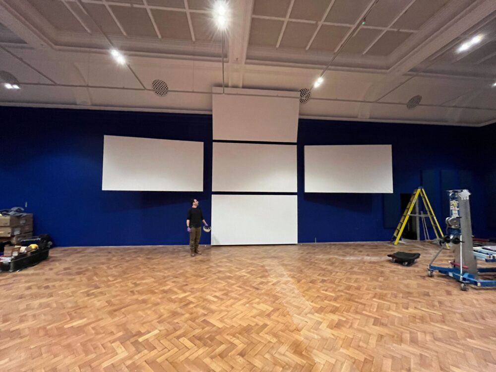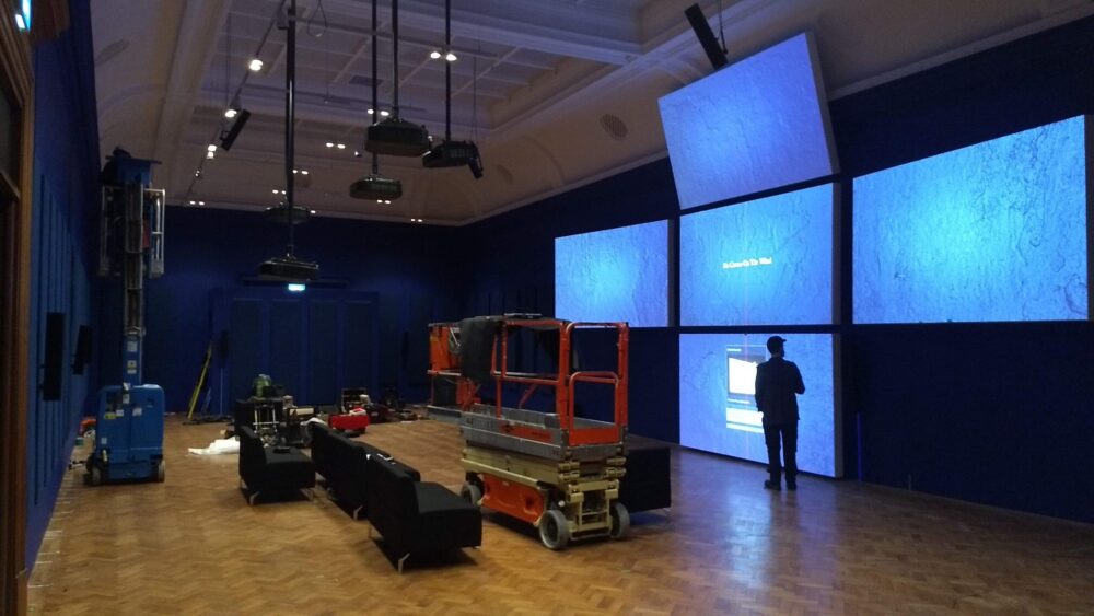 Spike Island Exhibition Services installed the UK premiere of ‘Arcadia’, a multi-screen film by legendary artist and filmmaker, John Akomfrah. Commissioned by The Box in Plymouth, ‘Arcadia’ is presented across five large screens in the shape of a cross, with eighteen channels of sound. With beautiful visuals of landscapes from across the globe, stunning underwater footage and a haunting soundtrack, the film reflects on ‘The Columbian Exchange’ – the widespread transfer of plants, animals, precious metals, commodities, populations, technology, diseases and ideas between the Americas, Afro-Eurasia and Europe – the ‘New World’ and the ‘Old World’ – from the 1400s onwards.