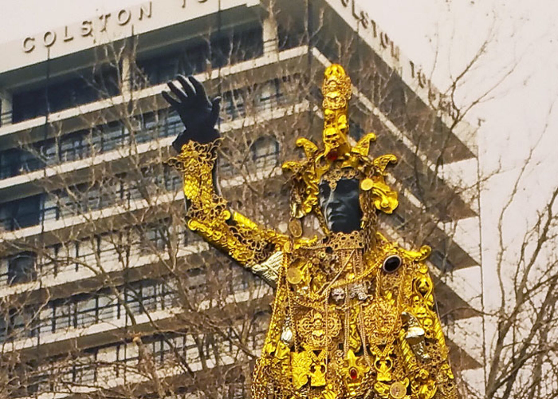 In that year, Spike Island commissioned renowned artist Hew Locke to create a new series of works. The result, entitled Restoration, explored Bristol’s relationship with statues and commemoration, and included a work that saw the statue of slave trader Edward Colston (the same one that now lies fallen and vandalised in the M Shed museum) adorned mockingly in gilt gold, glitter, corrie shells and trade beads, a work that seems more relevant than ever.