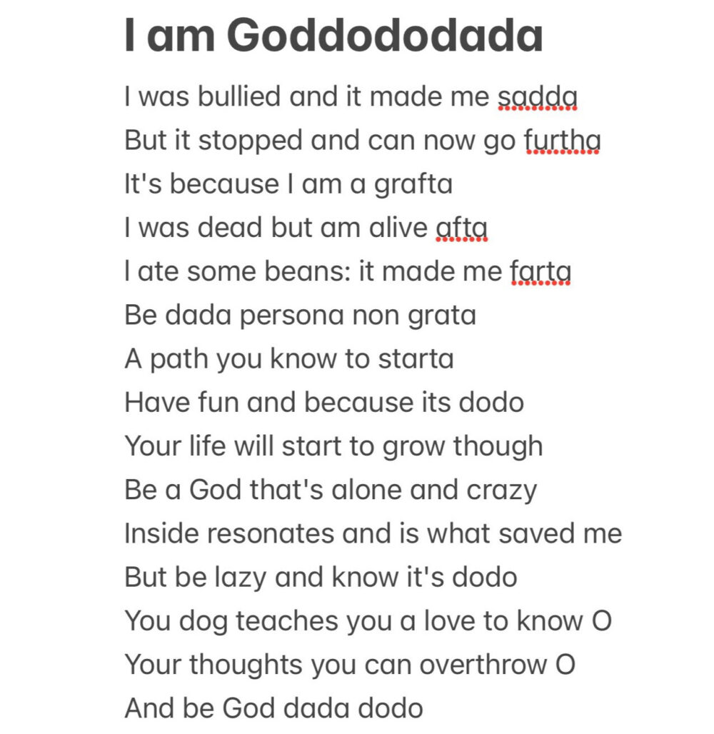 As @goddododada, his Instagram poetry persona, Harding writes poems as a way of processing and managing mental health. This practice enables him to transform internal experiences into structured, cathartic expression, helping to externalise thoughts and ground his wider artistic practice.