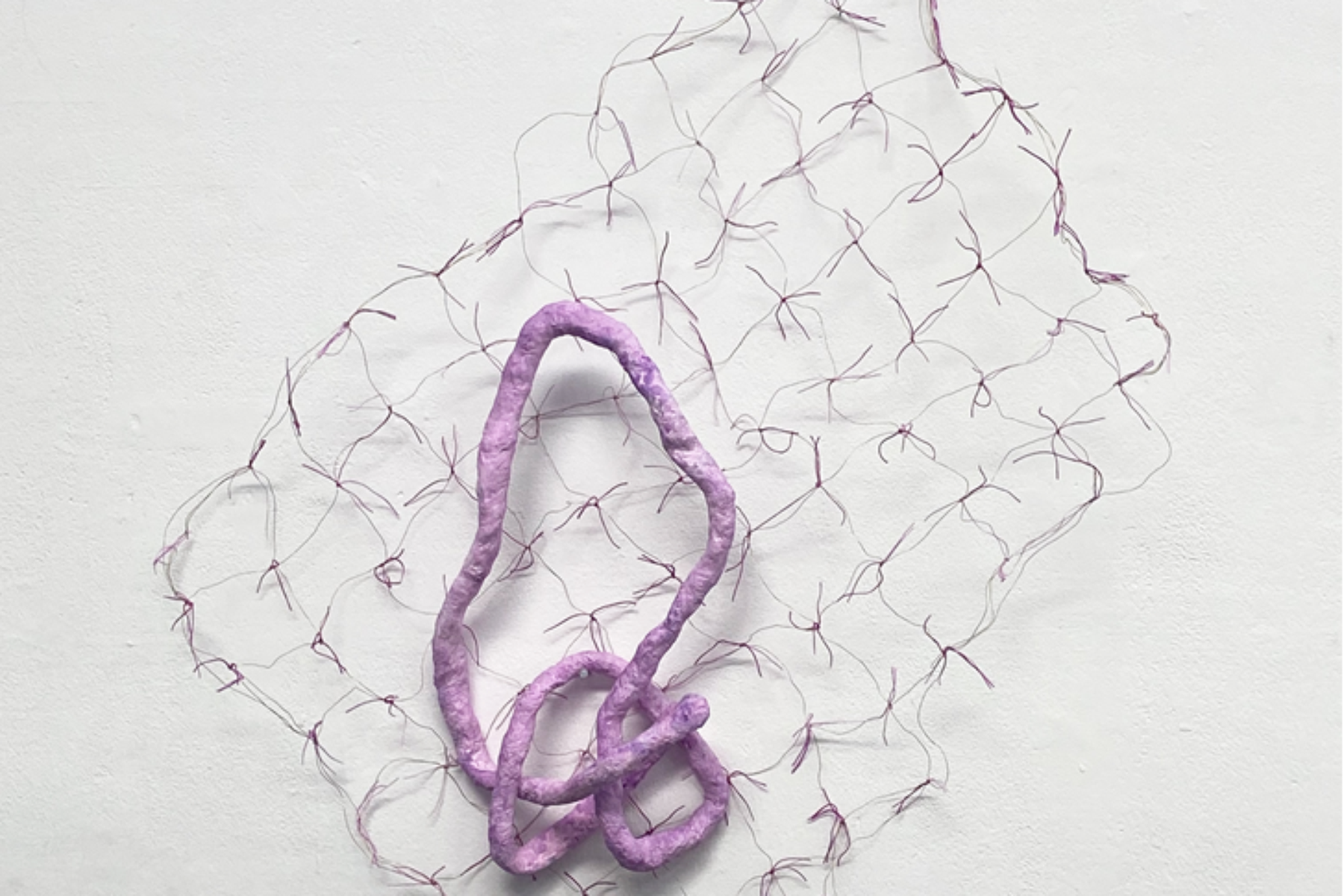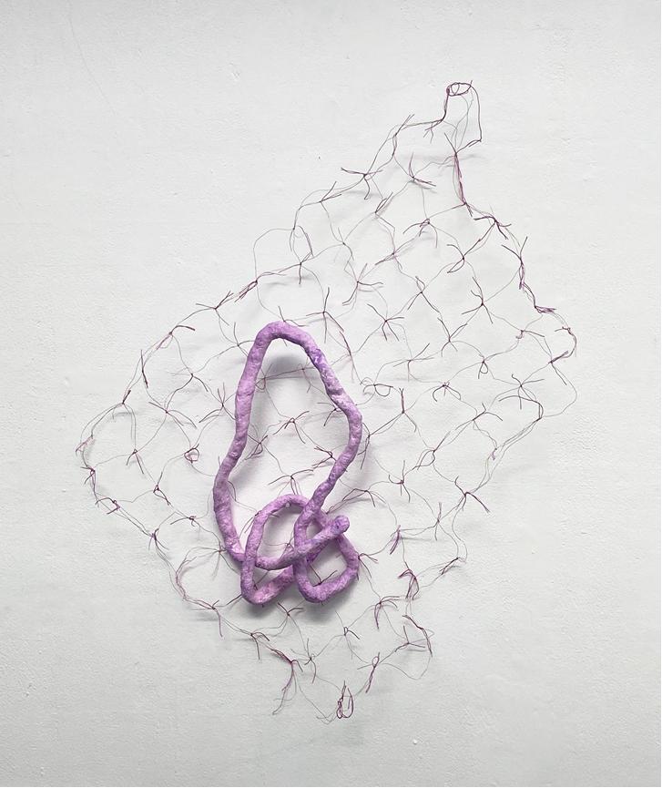 Jo Ball is an artist working in drawing, sculpture, installation and writing. From her (often very messy) studio she makes colourful things from paper, plaster and string that suggest bodily organs and knotty systems of thought.Through making she thinks through ideas of embodied knowledge, subjective experience of time, and emotional responses to colour and form. Repeating motifs and materials include knot-like structures, nets and thread.