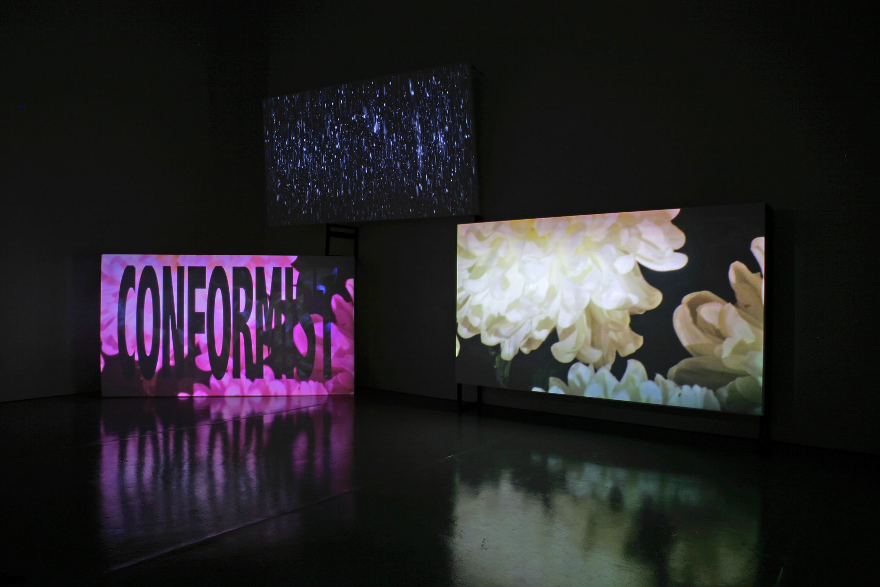 A flashing text interrupted the sequence, channelling psychological transmissions from two central characters whose divergent philosophies ultimately merge into one nihilistic polemic. The first was the estranged European émigré adrift in LA, railing against the culture machine’s habituation of nature and espousing a form of ideal space that can only be achieved through self-enforced seclusion. The second was the voice of the new world order, purporting to embody nature as self-empowerment. Both characters ultimately descend into a form of psychosis where their radical individualism leads either to dark suicidal horror or pure physical violence.