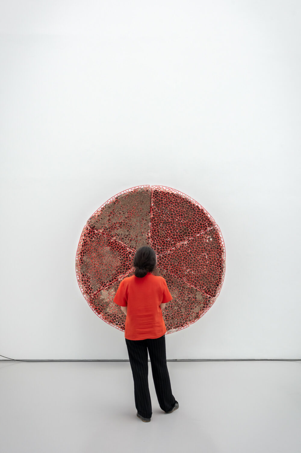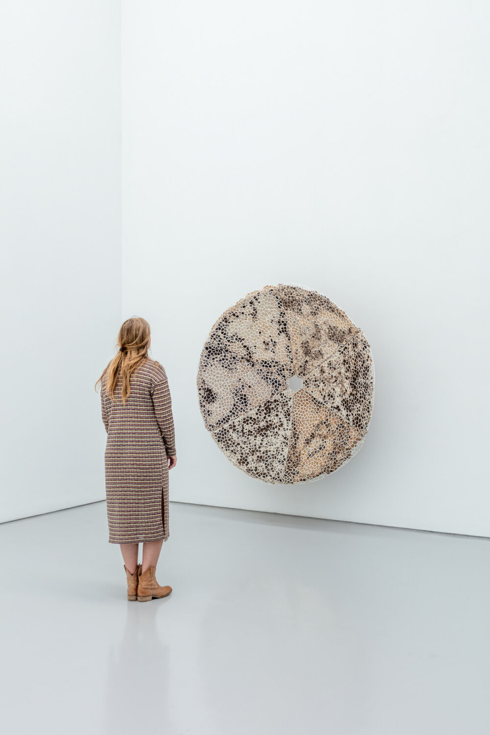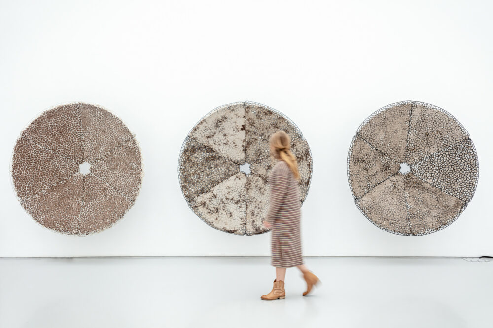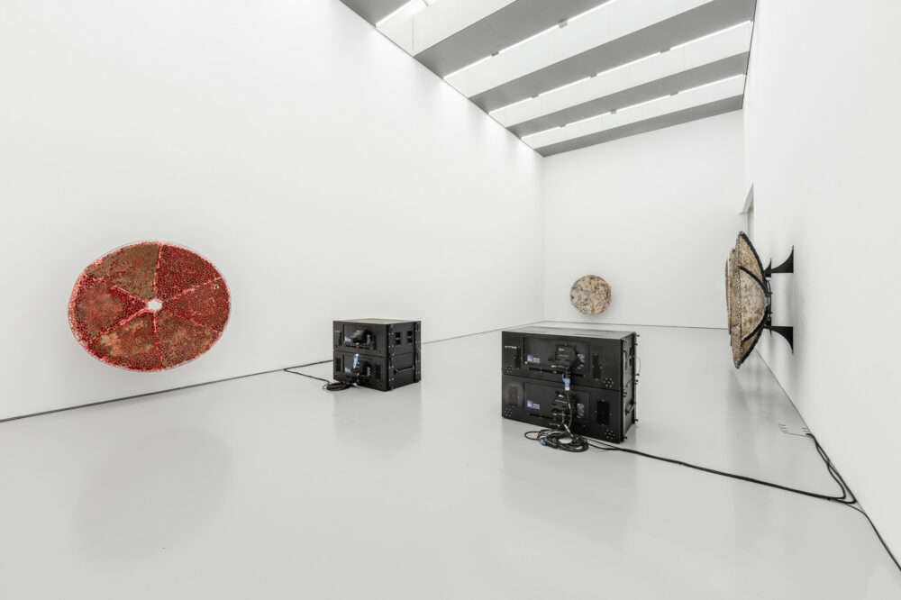 Laying and hanging around the speakers are five sculptures, collectively titled Graft (2022), that gently quiver from the inaudible tremors. Made from a 3D-printed mesh structure based on a Voronoi diagram, they are clad in coarse handmade paper made from by-products including decomposing plant fibres (from the forest) and shredded confidential documents (from Spike Island). Taking the shape of parabolic satellite dishes, they are also what Romm refers to as “non-communicative objects”, both familiar and unclassifiable as antennas or listening devices.