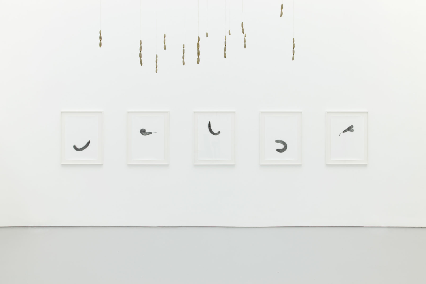 The rhythms and forms of daily life were also a source of inspiration for the new work. Varieties of cucumbers proliferate throughout the exhibition; grown from seed by the artist, they operate variously as proxies for vitality, growth, reproduction and acts of tending and nurturing. Multiple brass casts of tiny gherkins formed a shimmering mobile – the spring rain of the title – while a series of hand-tinted photographs of curly cucumbers shot on stark white backgrounds, like marks made on paper, pushed towards language. The artist frequently reflects on family, and on 16 March her father, Peter Beasley, was present in the gallery to meet visitors.