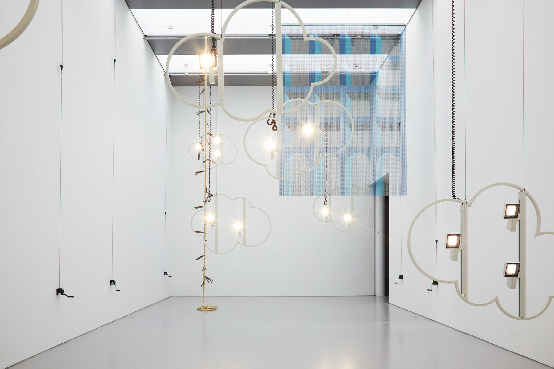 Elements of theatre design are considered in relation to exhibition making, introducing a number of set changes that saw the works being rearranged and repositioned. Suspended from rigging, the works in gallery one, much like theatre flats, were raised and lowered via a system of pulleys and counterweights. Each day the position was altered to a pattern of different set configurations or to meet the needs of local theatre groups who were invited to use the space to rehearse.