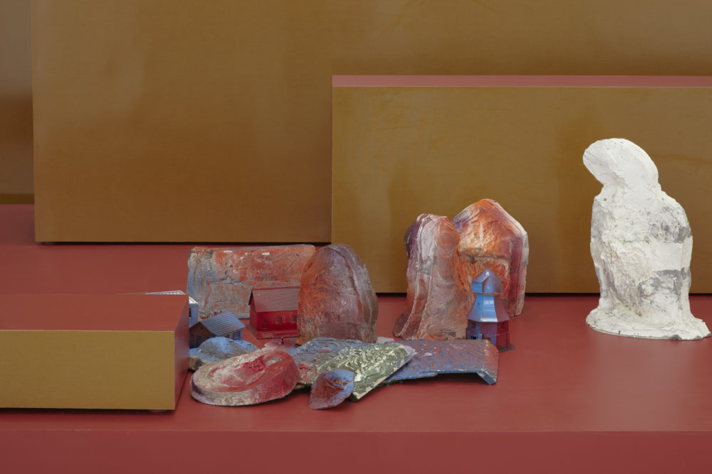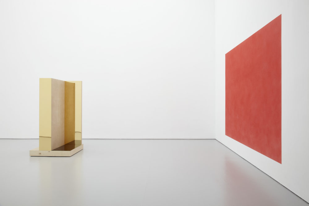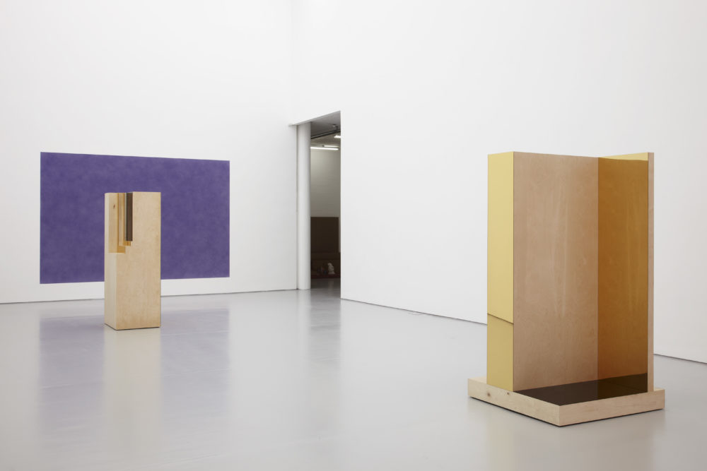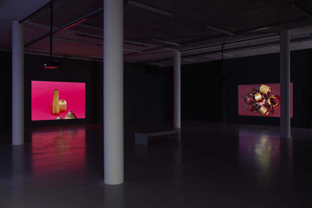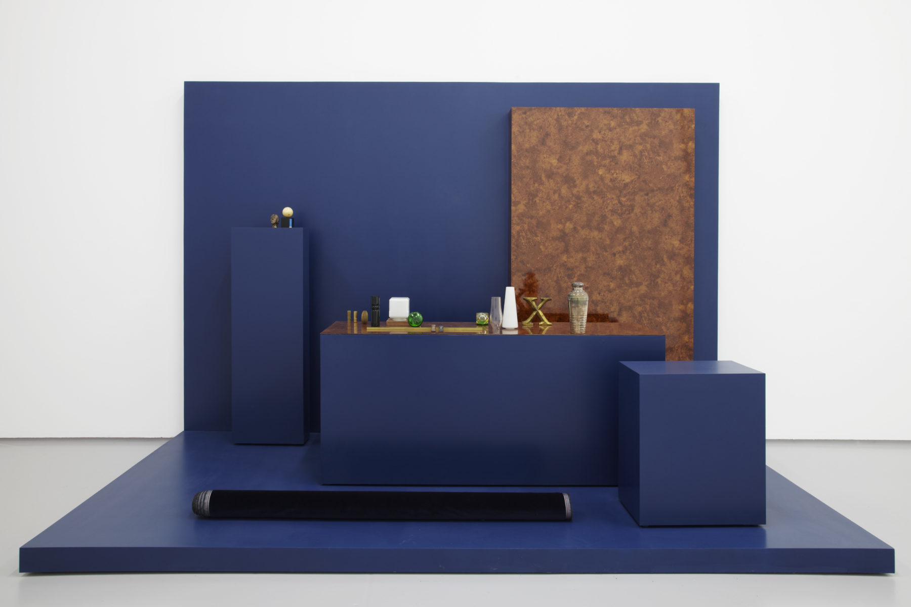 At Spike Island, Cornaro presented a series of specially commissioned installations in which she continued her investigation into composition, visual perception and interpretation. These tableaux, which could be described as physical representations of the act of watching, activated specific viewpoints reminiscent of cinematic and editing techniques (framing, focus, close-up, wide angle, tracking, sequence shot etc.). Each tableau created a self-contained space with varying perspectives, in which the objects were returned to their ‘destiny of fetishes, which is to shine from a distance’, in the words of the French film critic Serge Daney.
