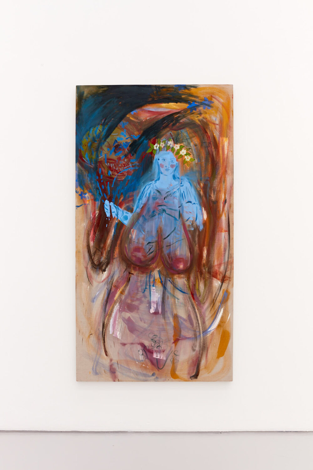 Surrounding the central installation is a series of new paintings and drawings. Made during Stein’s second pregnancy and throughout the Covid-19 pandemic, these new works reflect on a period of intensive domestic caregiving and anxiety. They combine Greek mythology, esoteric culture, and ecclesiastical and medieval imagery with vibrant tableaus that depict a wide range of western female archetypes. We see Mary Magdalene (2021) mournfully kissing the wounds of a dead Christ; an exuberant young woman with exaggerated breasts holding an ear of corn in May Queen (2020); and a tussling, half-naked old woman in Hag Fight (2020). Through these works Stein brings in the notion of the numinous – a religious or spiritual quality – in an attempt to describe the real, the symbolic and the imaginary.