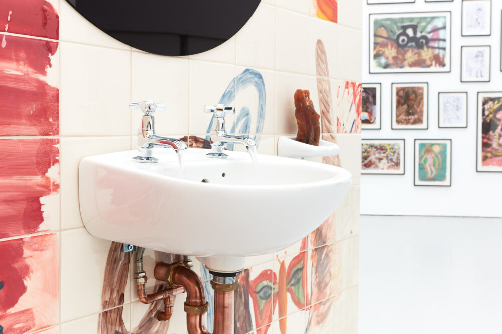 Spike Island presents Wet Room, the first major solo exhibition in the UK by Cornwall-based artist Lucy Stein (b. 1979). Working primarily with painting and drawing, Stein’s show is inspired by the fougou: narrow Neolithic underground passages unique to West Cornwall that lead to womb-like chambers and have become sacred sites of worship. Echoing the ritual rebirthing ceremonies that are believed to have taken place within these uterine caverns, the exhibition centres around an installation comprising a bathtub and sink with running taps, surrounded by tiled walls that have been hand-painted with scenes relating to the artist’s study of western esoteric traditions.
