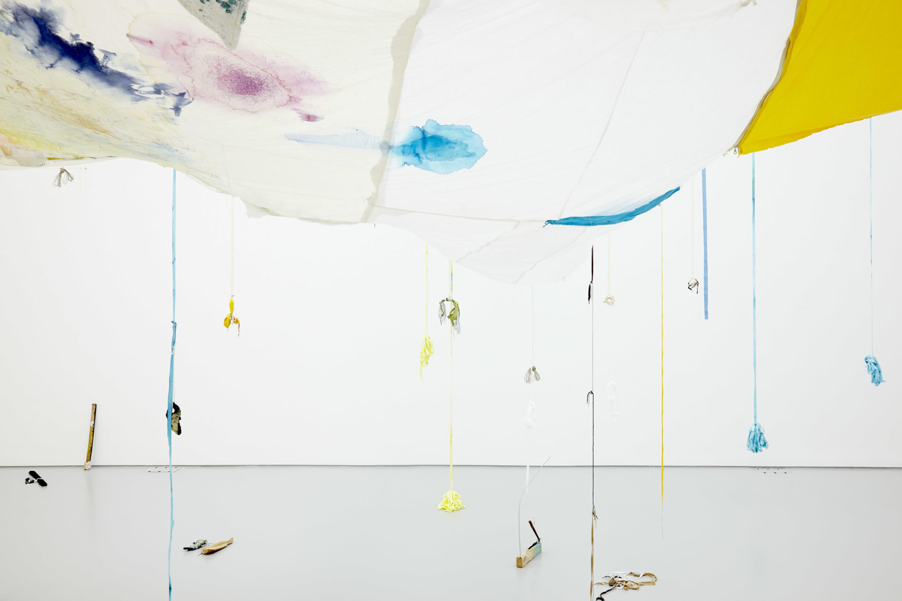 Pulfer’s project for Spike Island, Gewässerzeiten (‘waters-times’, to give a literal translation of this neologism coined by the artist), involved a giant fishing net, silt sourced in the local river and watercolours representing territories surrounded by seas; in short, the exhibition was all about water. For his first solo exhibition in a British institution, Reto Pulfer installed a knotted a large-scale net, hanging from which were bells, ribbons, dehydrated food and ceramics fired by the artist on the opening night during a live performance. These pieces, removed from the kiln while still glowing hot and subjected to a fast cooling process in sawdust, bear the marks of their making. Their intense colours and crackled surfaces are the unpredictable outcomes of the traditional sixteenth century Japanese Raku pottery technique, which reflects Pulfer’s interest in working with chance operations. An ambient soundtrack of looping guitar riffs and chords created by the artist accompanies this installation.