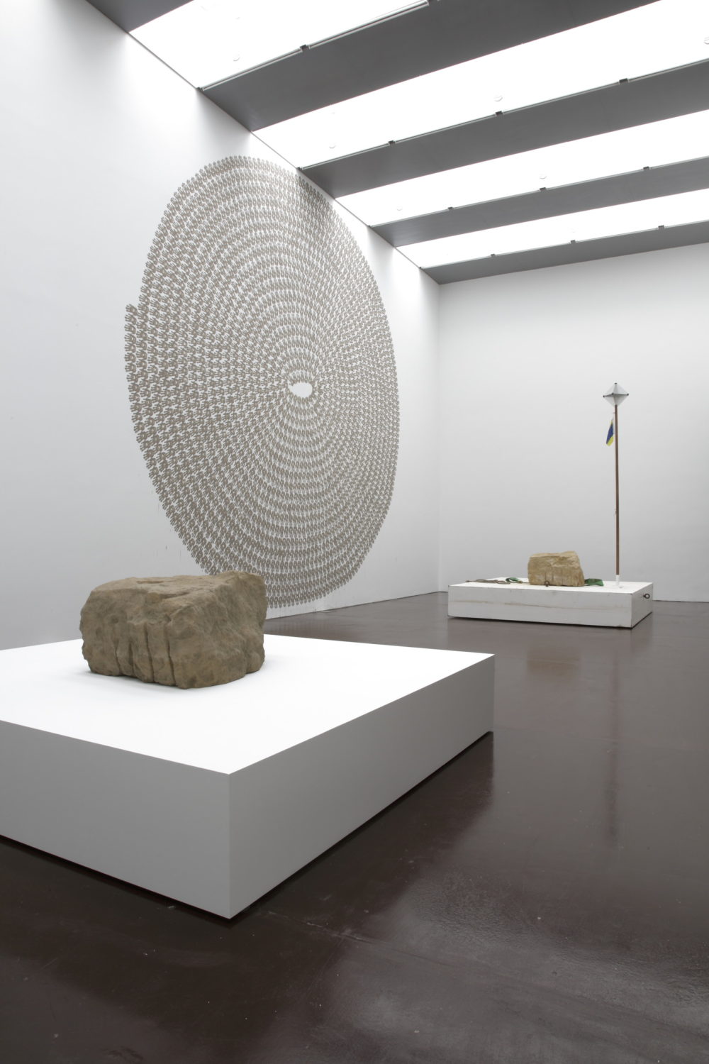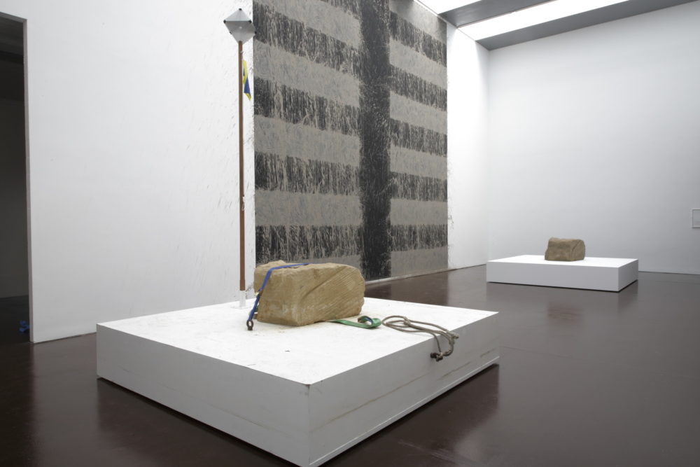 Against the backdrop of Long’s drawings, Simon Starling presented a new commission comprising of two roughly cut but apparently identical lumps of rock displayed on large white plinths. One of these rocks, a ton and a half of locally sourced inferior oolite, made an epic journey on its plinth which in this case doubled as a simple raft. Propelled by the considerable power of September’s spring tide, the rock made its way 5 miles from Avonmouth into Bristol’s historic Floating Habour. The Avon has the second highest tide in the world, often reaching 14.2 metres. Following this initial tidal voyage, the rock then made a subsequent journey, its rough-hewn form momentarily dematerialised into a stream of digital data and transposed in minute detail onto another block of stone using a computer-guided milling machine – it’s almost science fiction-like, high-tech transposition playfully parodying the simplicity and economy of the original rocks river run.