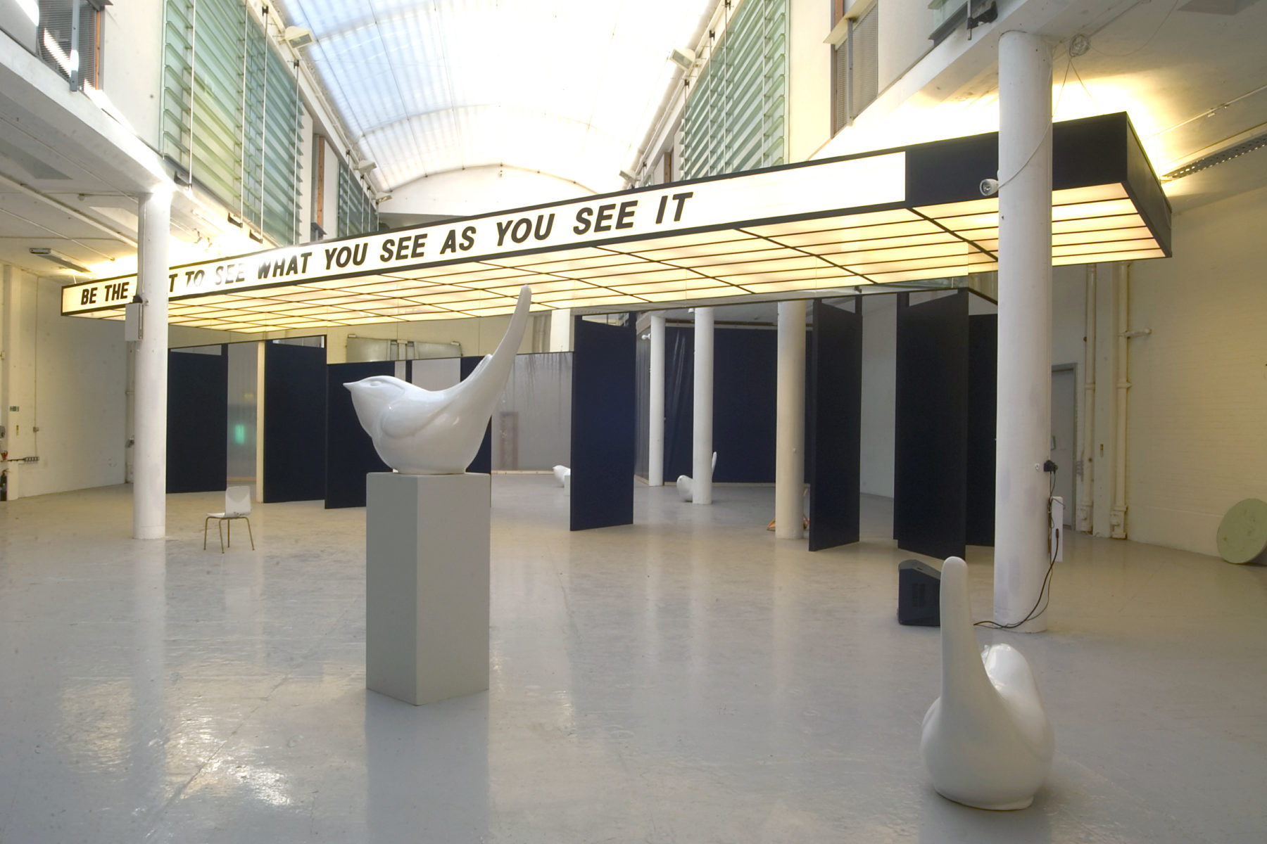 Hiraki Sawa clearly plays with scale, usually things are reduced to being smaller than life-size. For Spin Cycle Sawa has used a small porcelain ornament of a bird and inflated its scale to produce a flock of identical birds, smooth and stylised, the surface, pure white and highly polished. The making of these objects is quite a departure as the work we are most accustomed to seeing are video pieces always set and created in his own domestic space, this type of space is for him the most comforting environment and backdrop for the production of his work. In the video piece Elsewhere, the reduced sized objects such as cups and teapots sprout legs and walk around, the limbs that the objects have sprouted may appear familiar as they are taken from the Eadeard Muybridge photograph sequences of people walking which Sawa has re animated.