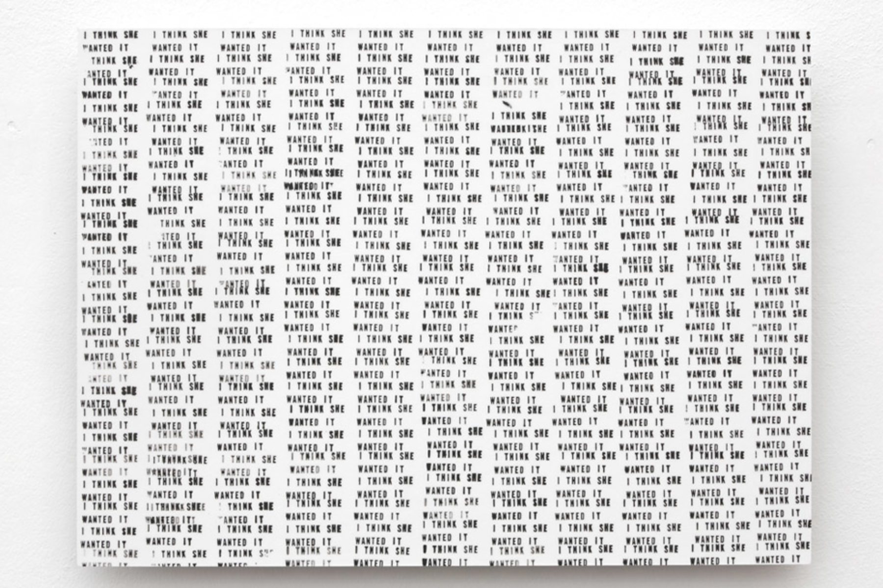 Central to Boyce’s practice is the act of working with other people in what she terms “improvised collaborations”, and here the artist took extracts from conversations with young parents, creating a visual and textual dialogue that speaks equally of young desires and insecurities. This installation did not, however, set out to be read as a portrait of the young women nor did Boyce intend to expose private lives in the public realm. Instead, many of the quotes were derived from the students’ responses to a work of fiction. That said, the pervasive use of a photographic group portrait of Boyce’s collaborators, which cleverly manifested itself as a recurring semi-abstract motif within an expanse of wallpaper, subtly paid homage to the artist’s associates, while avoiding sentimentality or affectation. In other works, through choices of typography, the artist re-interpreted quotes to create a series of artworks that produced a fragmentary experience of longing and raise wider questions about the nature of due care in contemporary life.