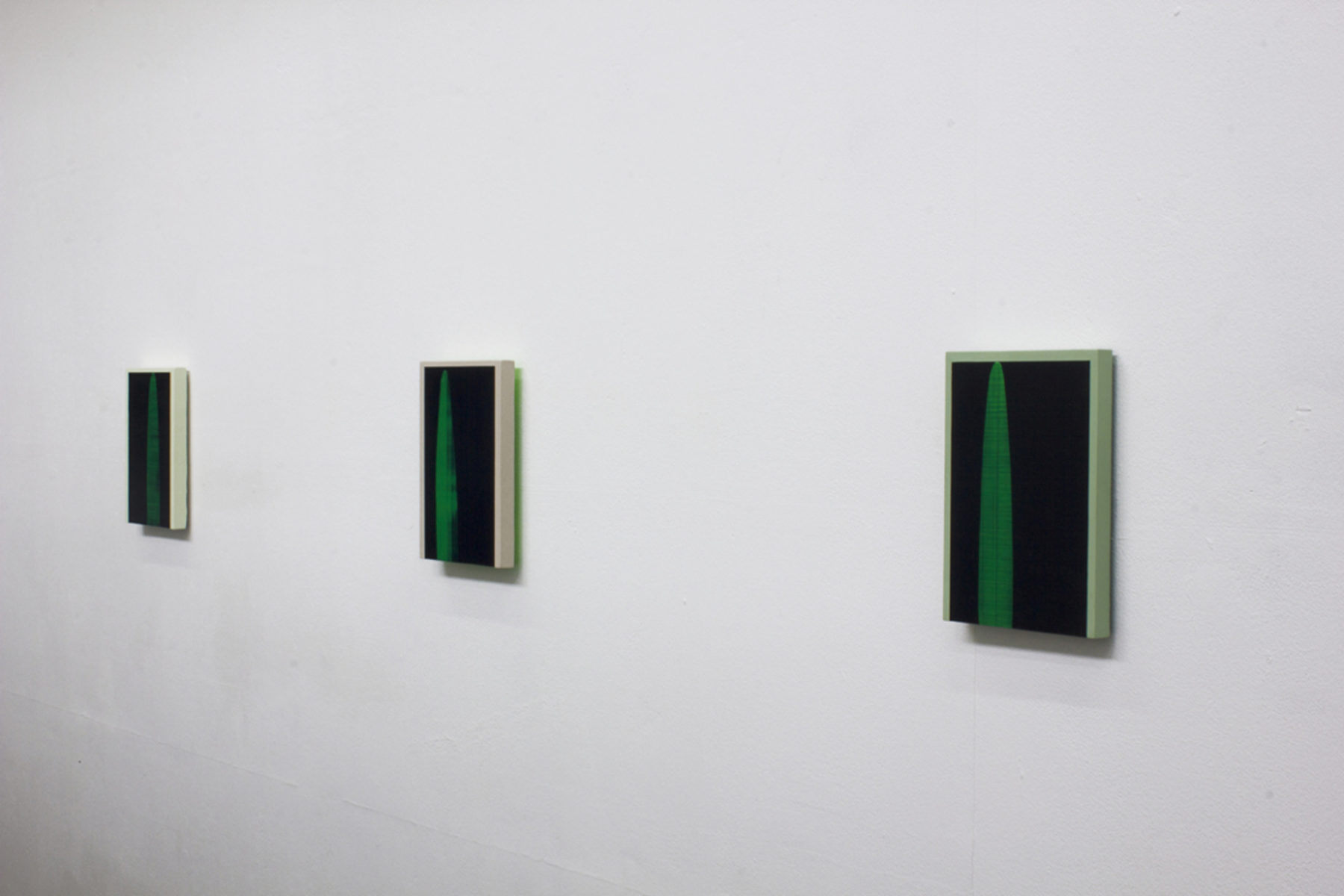 The Datum: a piece of information, a title for a painting. Within these tunnelled pastel frames a singular paint mark glows green, out of the depth of a darkened void. Recollection of a smartphone interface, in reality a handmade painting. For this exhibition, Jackson explores the incarnations of these paintings – original form, inserted form, vinyl form, positioning – inside and outside the gallery.