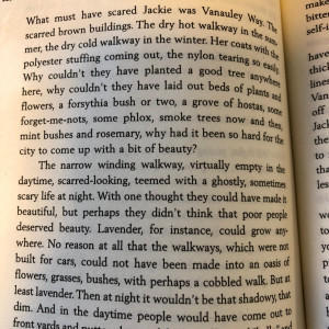 This is the paragraph about the need for and effect of plants …. but unthought of by housing planners building for working class black people in Toronto. It’s from Dionne Brand ‘What We All Long For’